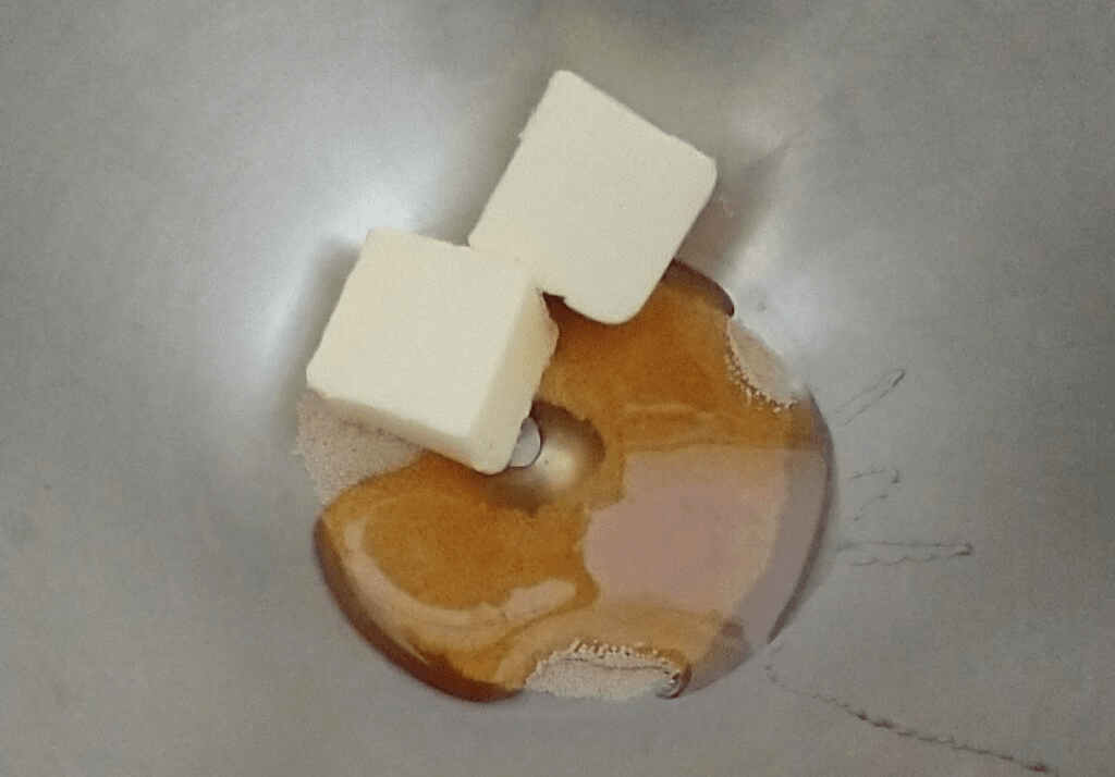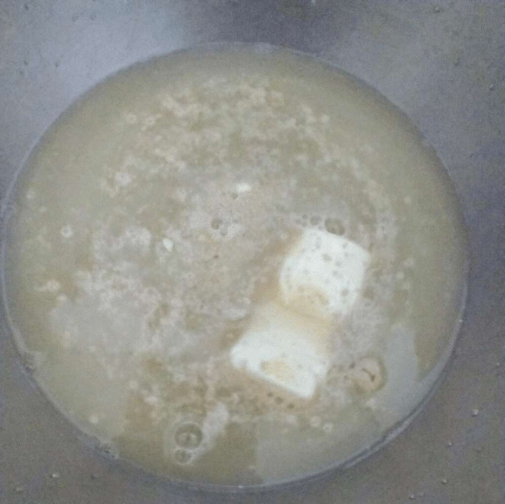 Add the warm water to your mixing bowl and give everything a stir to dissolve. The butter will soften and begin to melt in the warm water. After about 5 minutes, you should see the yeast beginning to bubble or foam. If it isn’t, you can either wait a few more minutes, or start with a fresh batch of yeast. Not the same yeast you just used, you’ll need to grab a brand new yeast package.