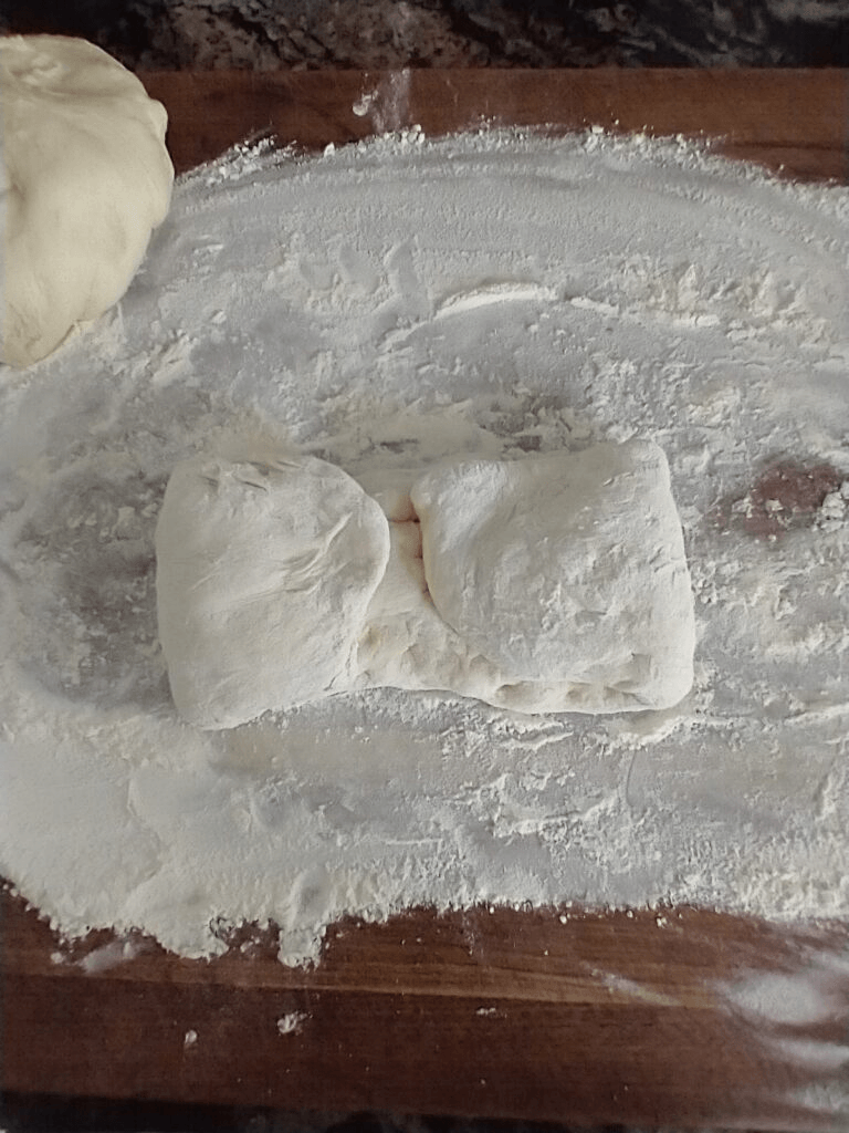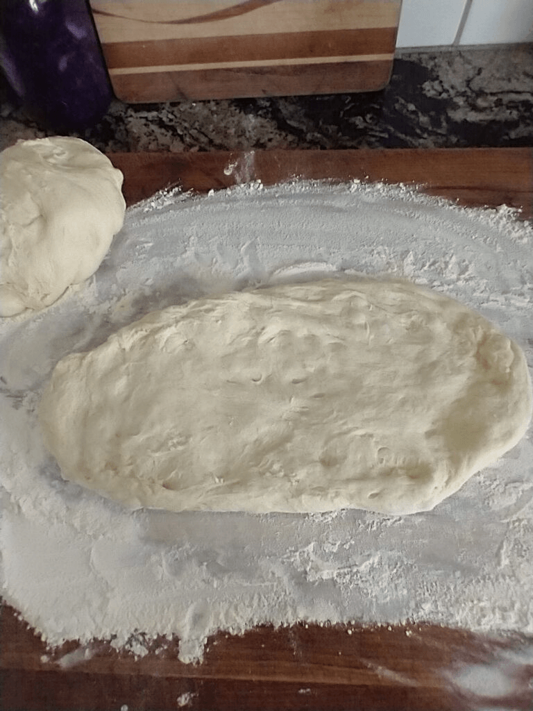 This can be done in multiple ways. The way I shape my loaves is to take one of the balls of dough and flatten it into a rectangle that’s slightly wider and longer than the loaf pan I will be baking it in. I just use my hands for this. I also make sure to pop any pockets of trapped gas by pushing my fingers down into the dough while it’s flat.