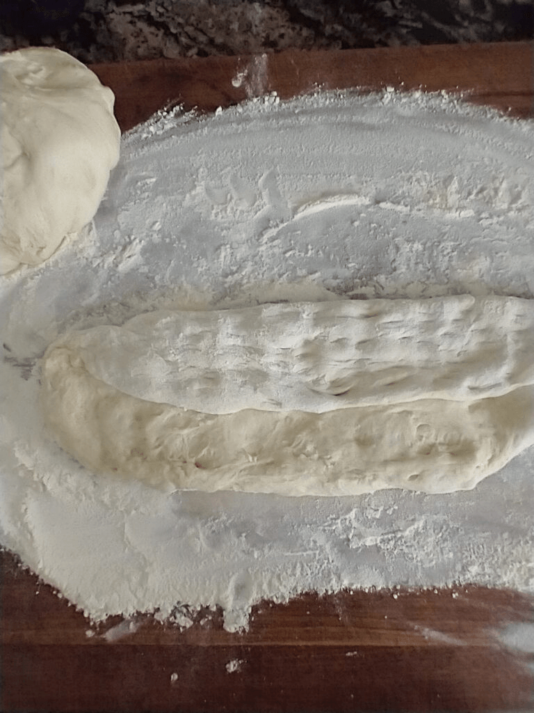 Once it has completed a second rise, take your bread dough out of the bowl and divide it into two equal parts, on a floured surface. It’s time to shape them into loaves.