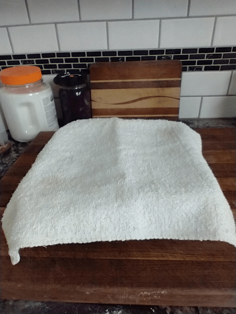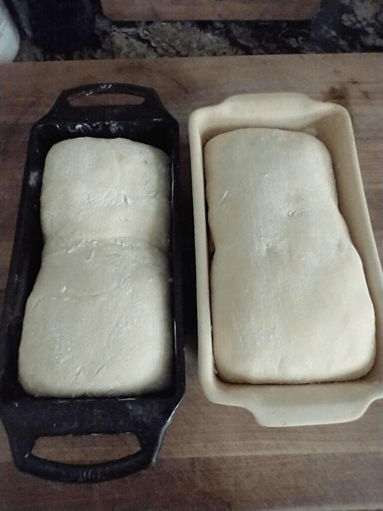 Place your loaf in your pan, with the folded sides toward the bottom. If your pans require, butter them beforehand. My pans need buttered, top, bottom, and sides. Once you have both loaves in their pans, cover with a towel and let rise for the third and final time.