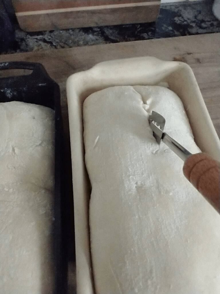 Preheat your oven to 350 degrees Fahrenheit. While your oven is preheating, you can decide whether or not you would like to add a cut down the middle of your loaves. For this particular bread, it is not necessary for baking, it is purely cosmetic. I like the look of the split top, so that’s what I do.