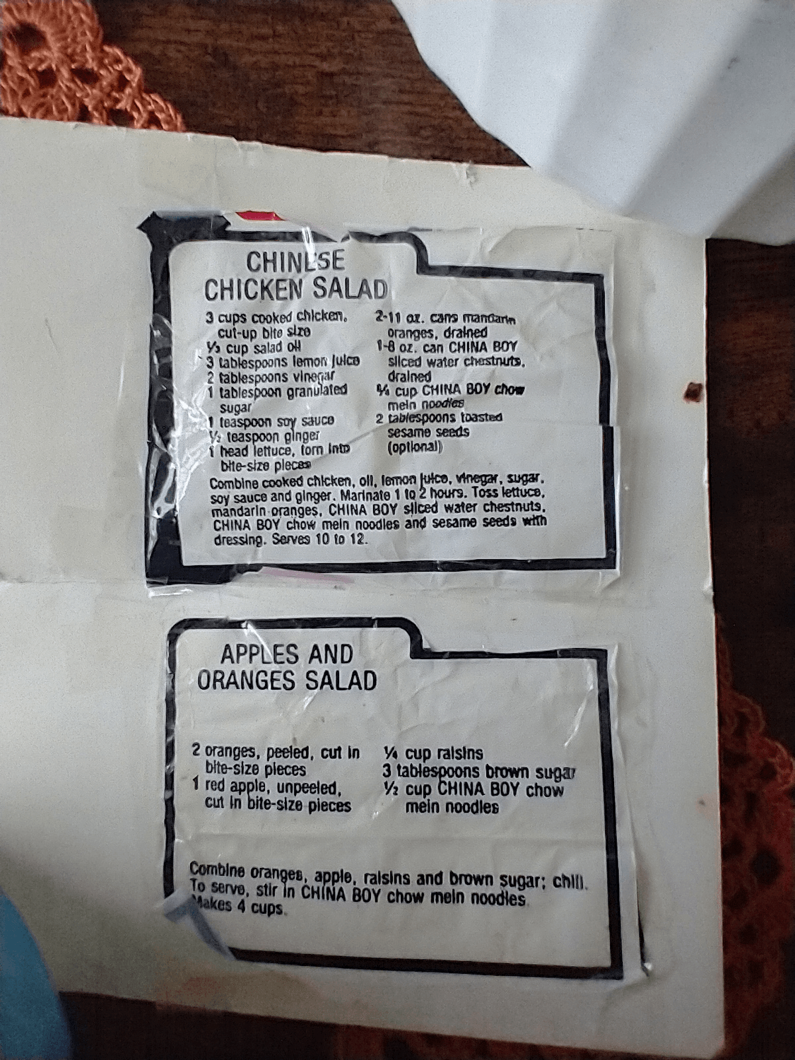 Not one, but two more salad recipes! Ha ha! Outside of not being sure if CHINA BOY chow mein noodles are still around, I think you can follow these recipes without a lot of interference from me.