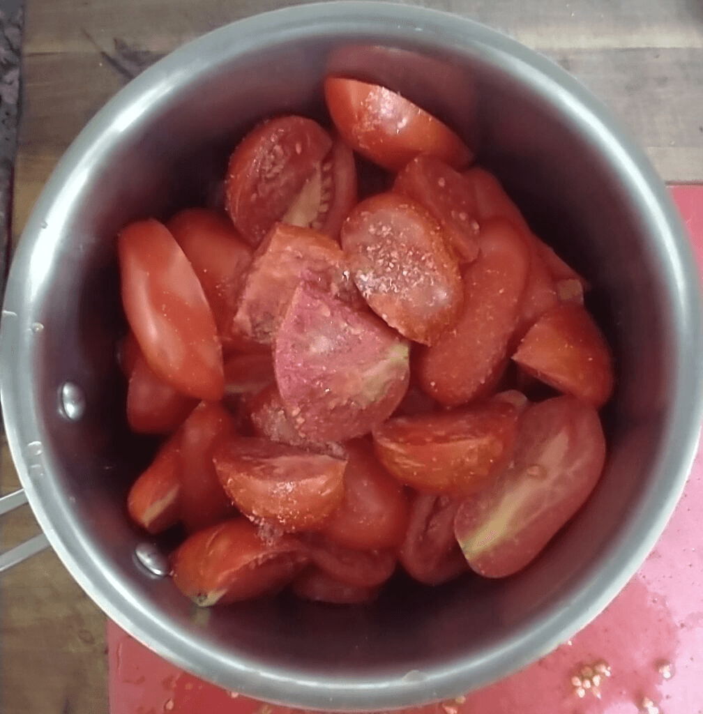 Start by cutting away all of the splits and anything that looks discolored from your tomatoes. Try to cut the remaining ‘good’ tomatoes into relatively similar sized chunks. Place the tomato chunks into your pot. Add salt and set pot on the stove. Turn your heat to medium or medium low and put the lid on your pot.