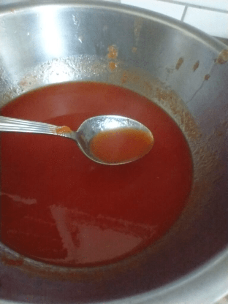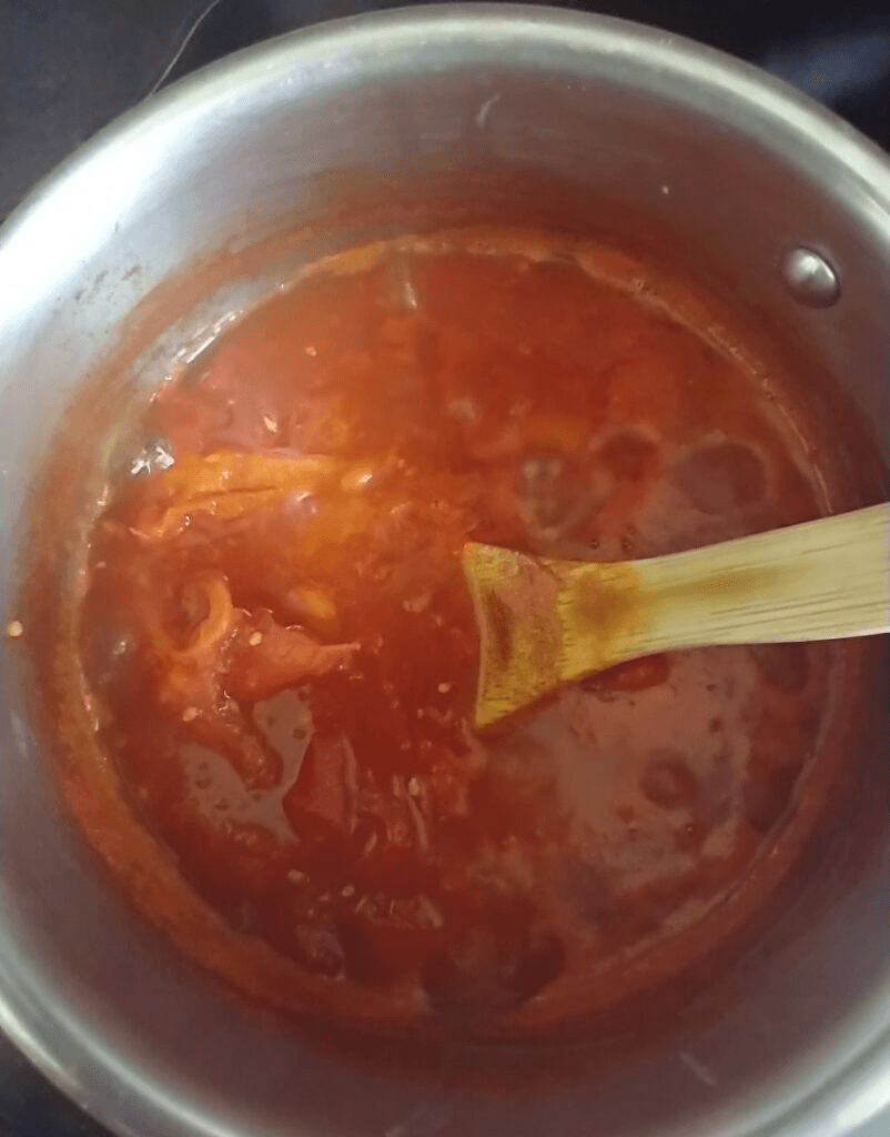 At this point you can choose to put the sauce into a clean pot and simmer it over low heat to thicken, stirring it regularly. (For my purposes, the sauce was thick enough already.)