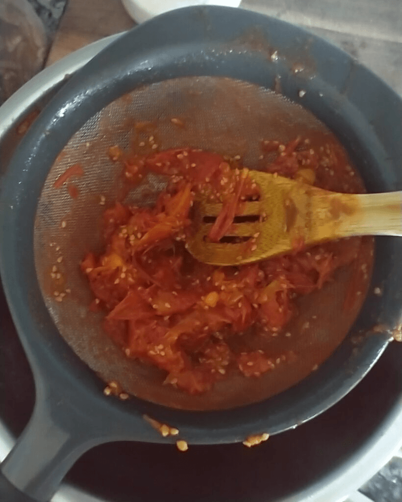 Turn off the heat. Place your strainer over your bowl and carefully pour the cooked tomatoes into the strainer. Using your spoon gently push the tomatoes through the strainer. You should be left with skins and seeds in the strainer, and a thin tomato sauce in your bowl.