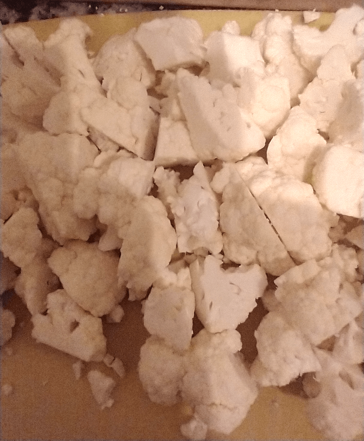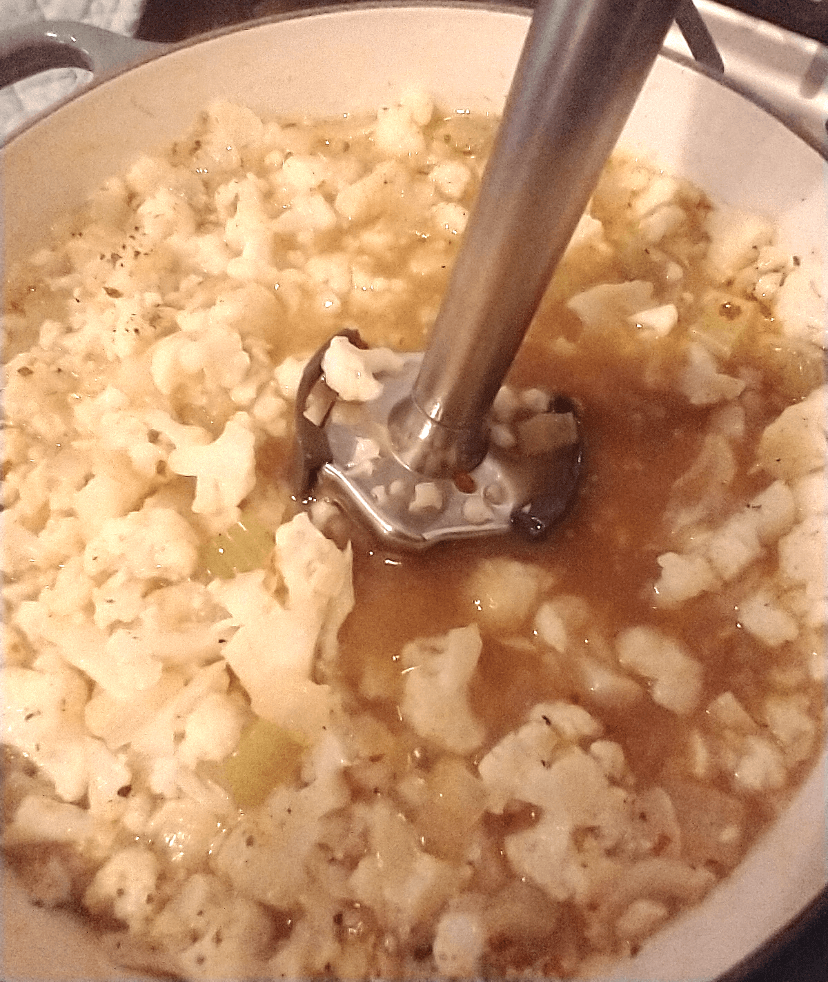Once your cauliflower is tender, turn the heat down to low. I like to do this so that I have plenty of time to do the blending.