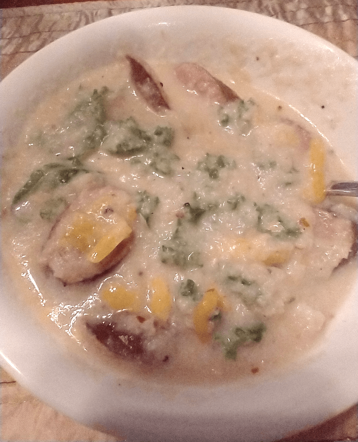 Add the kale and sausage, stir and let sit until the kale begins to wilt and the sausage is heated through. Take off the heat and enjoy!