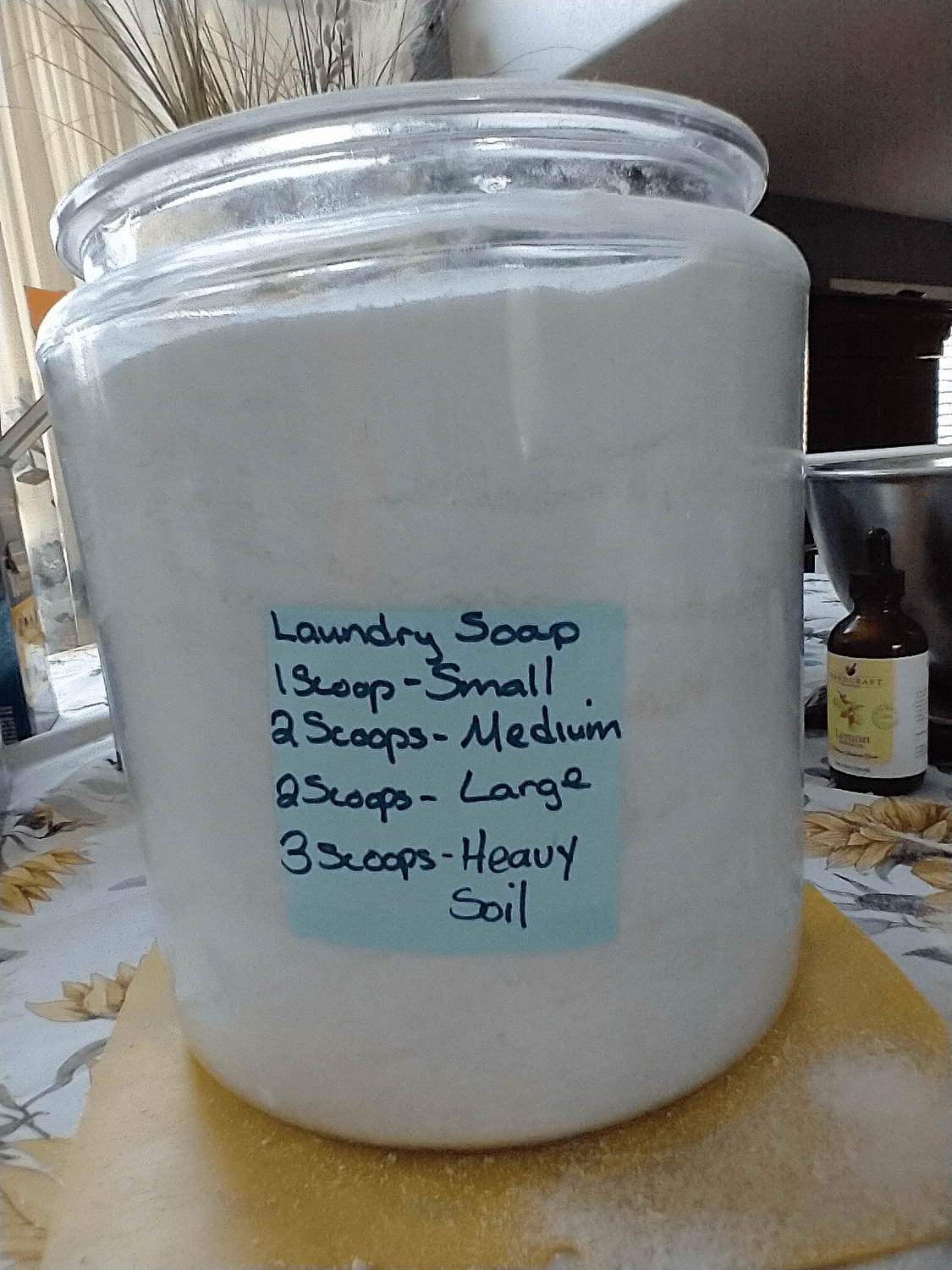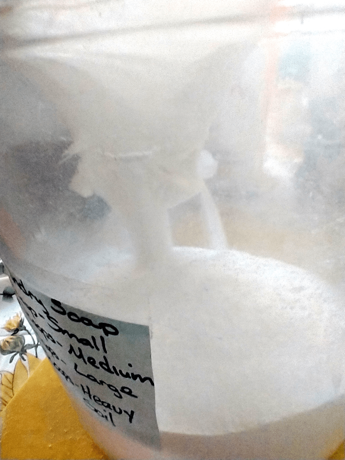 Large lidded container for finished laundry soap.