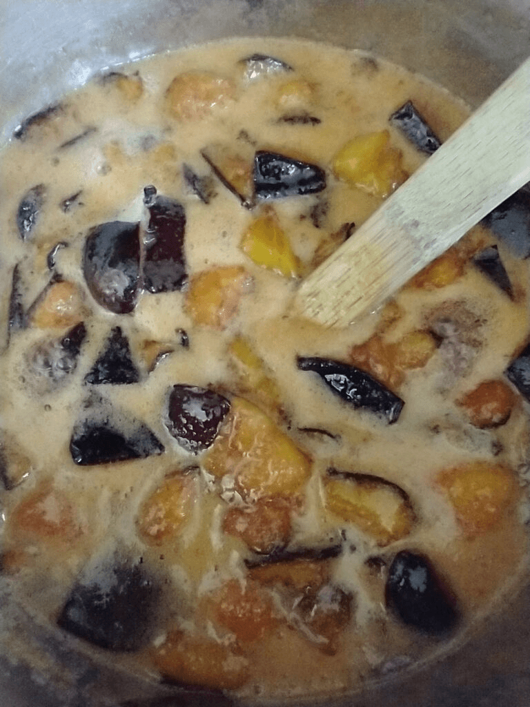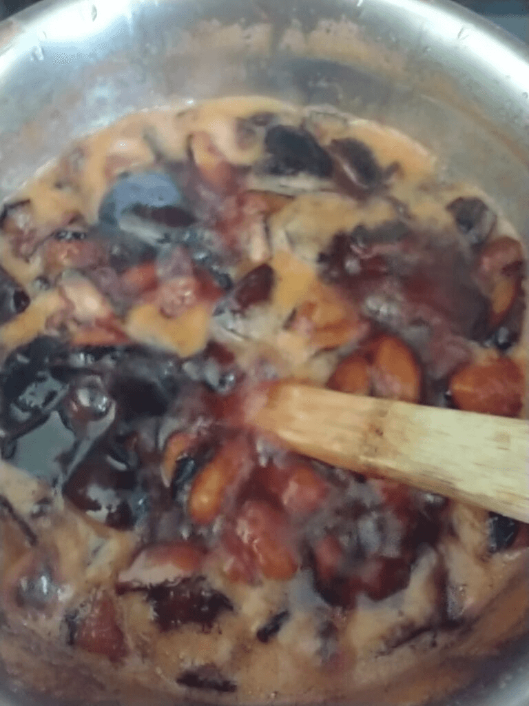 Put the chopped plums, sugar, and water in a pot. You will need to have enough room to accommodate the mixture bubbling up as it cooks. Place the pot on the stove and cook over medium-low heat, stirring occasionally.