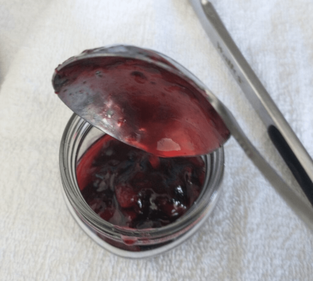 Pull your plate out of the fridge or freezer and put a spoonful of the jam on it. Tilt the plate so that the jam spreads out in a thin layer. Push or draw your finger through the jam. If it makes a clean trail, and starts to kind of wrinkle as you push it, it’s ready to jar. It your jam is too thin still, clean your plate and put it back in the cold for a few minutes, and test again.