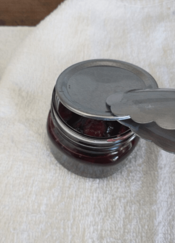 Grab a lid from the pot with your tongs and place it, seal side down on top of your jar.