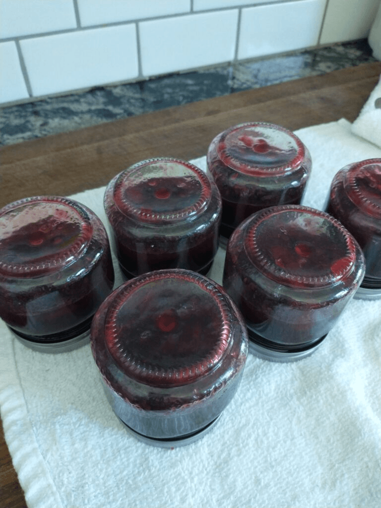 Cover your jars with another towel and let sit. You should start hearing little popping sounds as the lids seal. Once cool, check the seal of your jars. Pressing in the center of the lid, it should be firm, not flexible. If your lids are flexible you will need to either water bath process them, or keep it the refrigerator and use it up faster. Water bathing is easy, just return your jars to the pot you sterilized them and cook them for about 10 - 15 minutes in gently boiling water. The lids should seal. If not, you are going to have to refrigerate your jam.