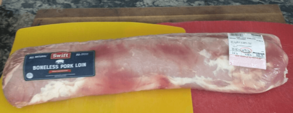 Boneless Pork Loin. I usually get mine from a bulk store like Costco or Sam’s Club. I also have a restaurant supply store that is open to the public where I live that carries them. Please note that I am talking about a whole pork loin, not a pork tenderloin. The whole loin is a much larger, and different piece of meat from a tenderloin.