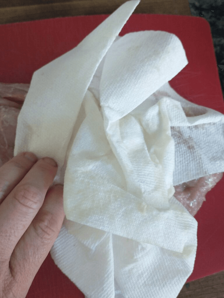 You need to get your pork loin out of it’s packaging and blot off any liquids with a paper towel. Keep some paper towels around for your hands as you work. Slippery fingers are dangerous when using a knife. You need to keep your grip dry.