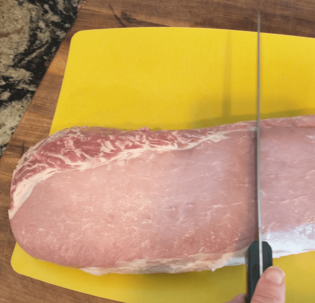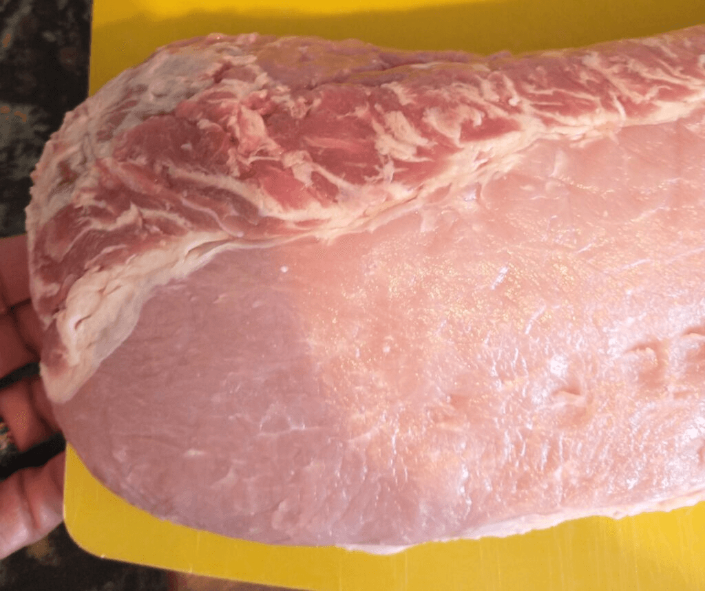 Let’s take a closer look at the pork loin. You should see that one side has a darker piece to it, maybe with a little marbling, something like this: