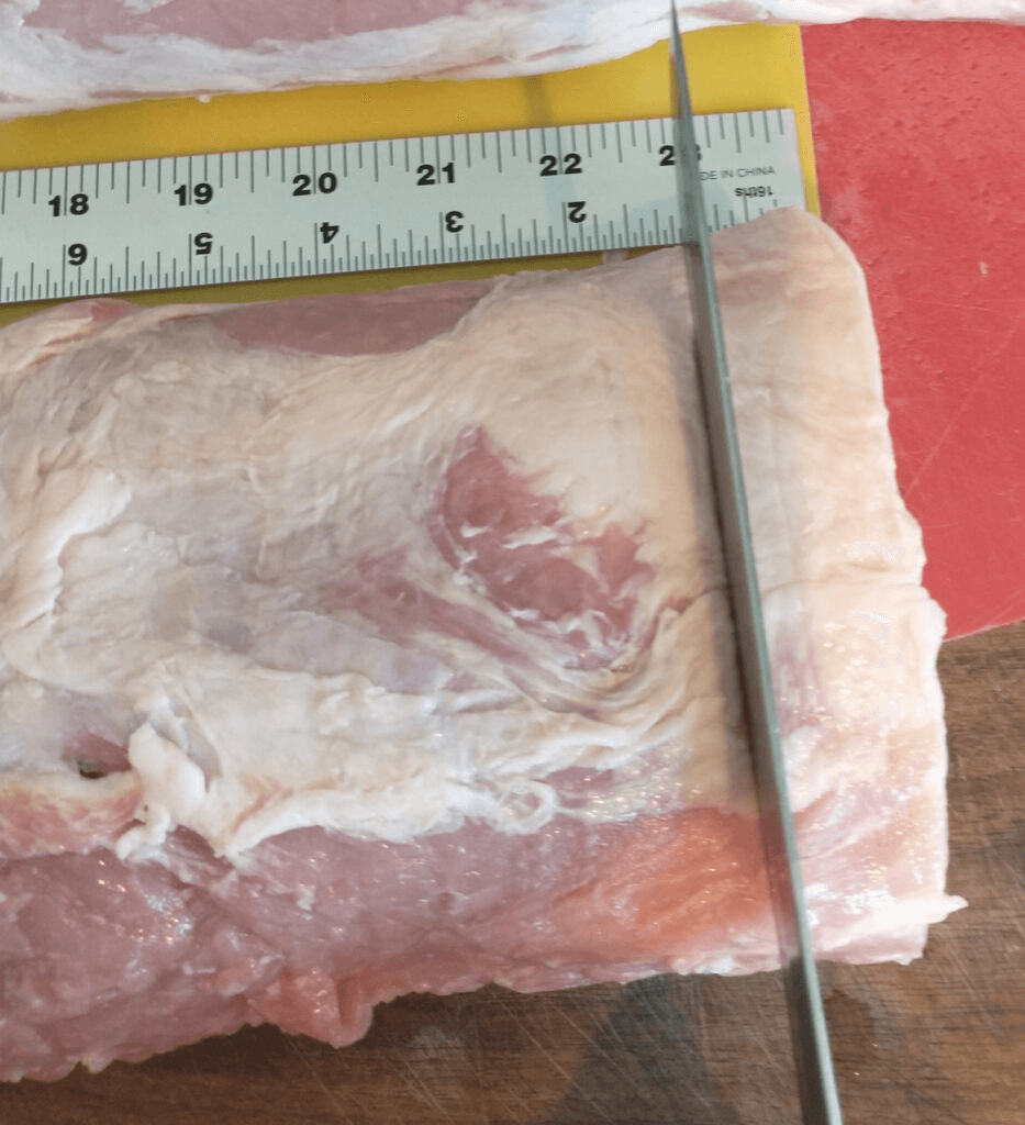 As you can see in the picture above, I line up the blade of my knife with a mark on the ruler, one inch in from the edge of the loin. This is where you will make the first cut. Hold your blade straight against the loin and draw it back toward yourself. You should now have a shallow cut and guide line. Line you blade up in this cut and pull back again. Repeat until you have cut through the loin.