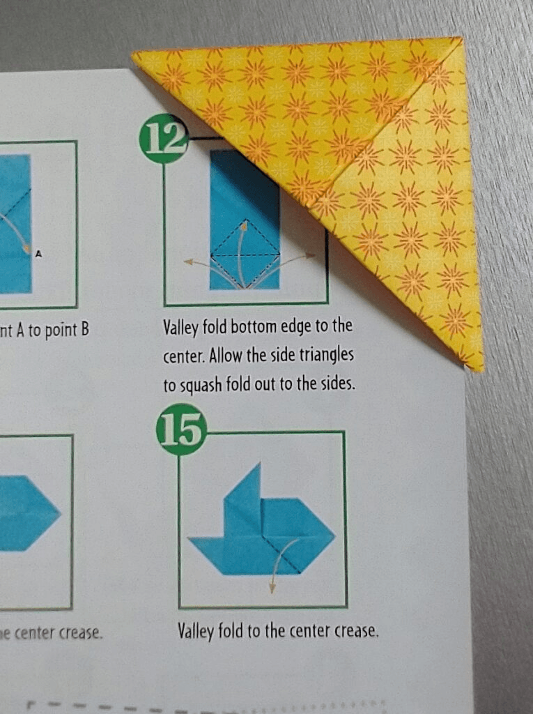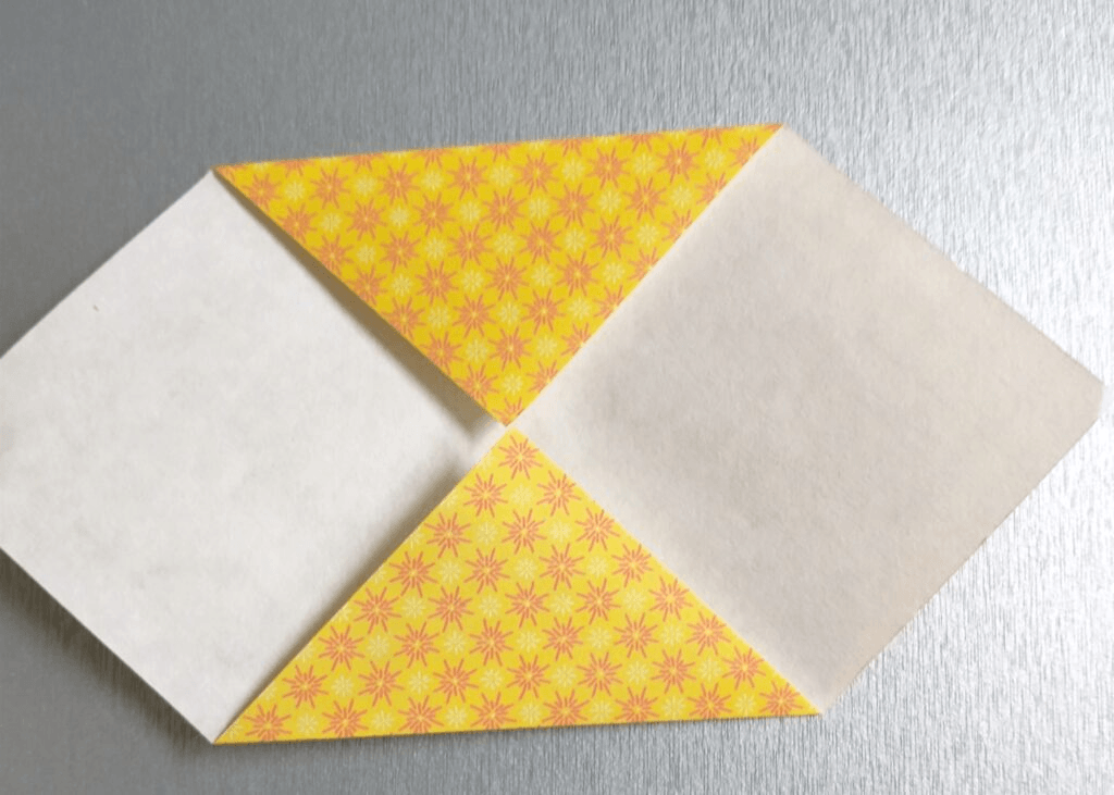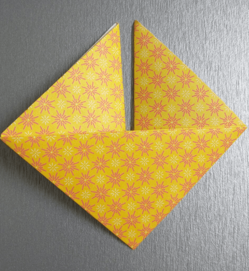 It’s time to take the two points along the bottom and fold them up to the top, making another diamond. It doesn’t matter which side you start with. I usually start on the left.