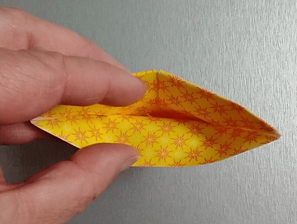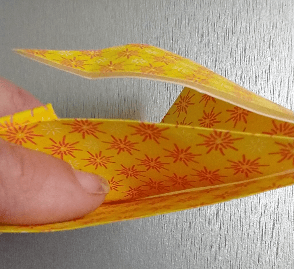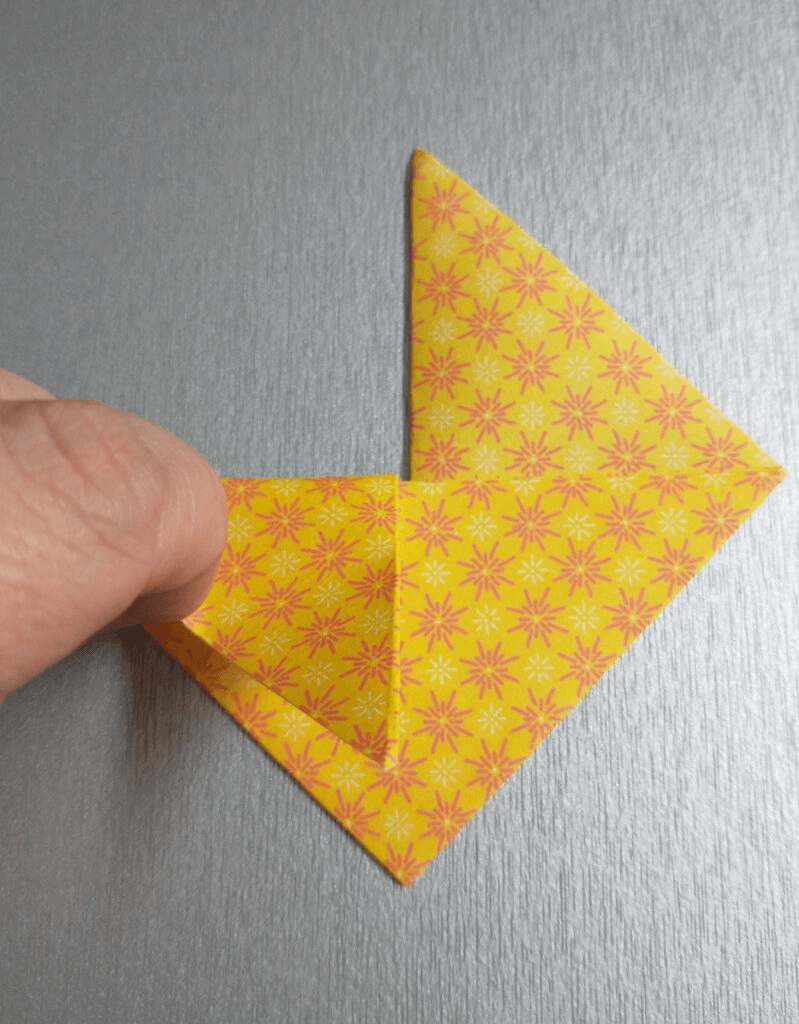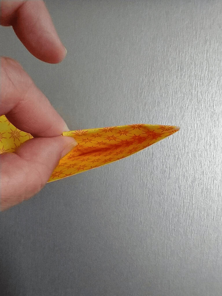 Once you have the folds opened back up, you will need to find the little ‘pouch’ that has formed. You will take those same points and tuck them into the pouch one at a time.