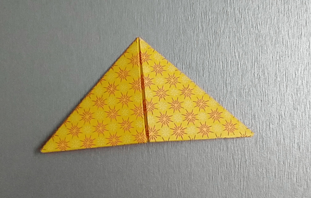 Start with the front side down, back side up. Fold the paper in half from the bottom, and then open it back up. It is important to make the folds as sharp and flat as possible, so you’ll need to run your finger or folding implement across the fold a few times.